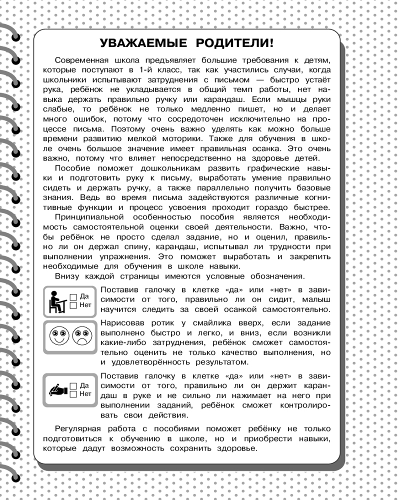 💳 Оплатить за товар можно при получении 🇰🇿 Есть бесплатная доставка по Казахстану 🎁 Копите бонусы с каждой покупки Серия: Прописи для дошкольников Книга от издательства «Эксмо» — это настоящая находка для родителей, чьи дети скоро пойдут в 1 класс. Пособие, соответствующее ФГОС, четко структурировано и поможет быстро и качественно подготовить руку ребенка к письму. Крупные занимательные картинки будут мотивировать ребенка, и он получит огромное удовольствие от своей деятельности. Занимаясь, дошкольник будет аккуратно обводить по пунктиру и проводить разные типы линий, проходить веселые лабиринты, рисовать узоры. Внизу каждой страницы имеются значки для оценки выполненных заданий. Поставив галочку в клетках «да» или «нет», ребенок сможет проконтролировать себя, а нарисовав ротик у смайлика вверх или вниз — оценить результат (хорошо / не очень хорошо). Постоянная работа с пособием поможет дошкольнику развить мелкую моторику, графические навыки, внимание, творческие способности, стать более усидчивым и аккуратным. |