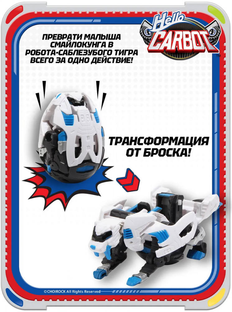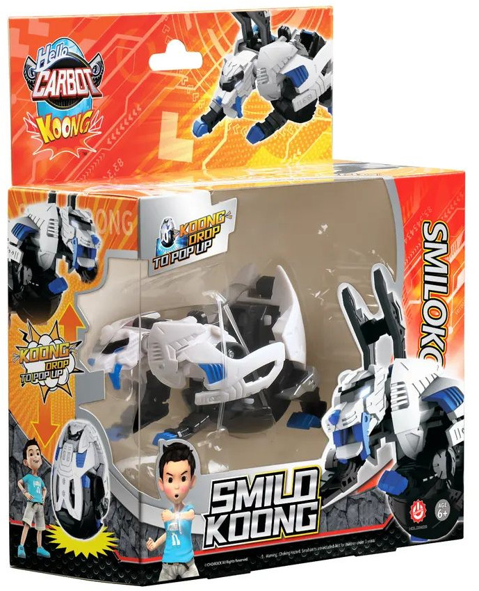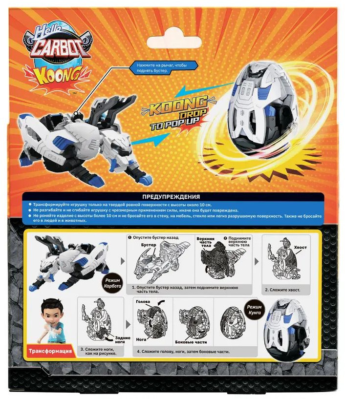 Серия: Koong Доисторические Карботы Кунги ждут тебя, чтобы отправиться в приключение! Трансформируй малыша Смайлокунга в робота-саблезубого тигра всего за одно действие — достаточно слегка бросить Кунга, и он раскроется! Активируй его супербустер, оттянув серый рычажок на спине, и Смайлокунг уже готов защищать своих друзей! |