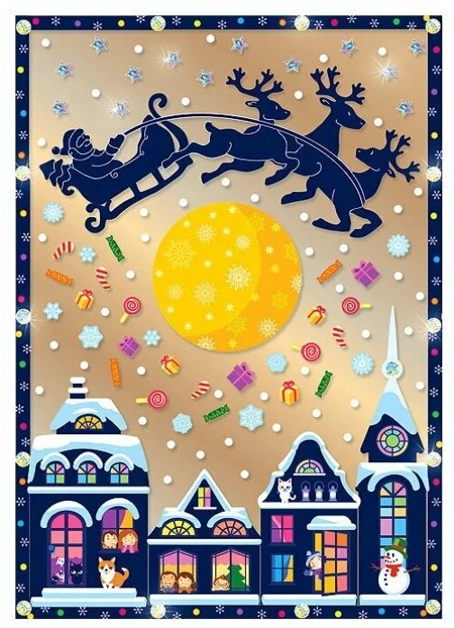 Картина-коллаж из стильных стикеров на затемнённом полупрозрачном пластике «Зимняя сказка» понравится ребёнку старше 8 лет: он легко наклеит на пластик части рамки и силуэты летящих по ночному небу сказочных персонажей — волшебника с мешком подарков в санях, запряжённых оленями; наклеит большую яркую красивую луну, дома с праздничным разноцветным светом в окнах, где радостные и удивлённые детишки и их домашние питомцы наблюдают за чудом новогоднего торжества; наклеят фигурки сыплющихся с неба вместе со снежинками подарков, леденцов и конфет, украсят блестящими голографическими наклейками фон картины и рамку. Особенно эффектно картина смотрится на фоне узора обоев, который слегка просвечивает сквозь полупрозрачный пластик кофейного оттенка. А в рамке из багета картина-коллаж превратится в настоящий шедевр и станет ярким акцентом в любом интерьере! |