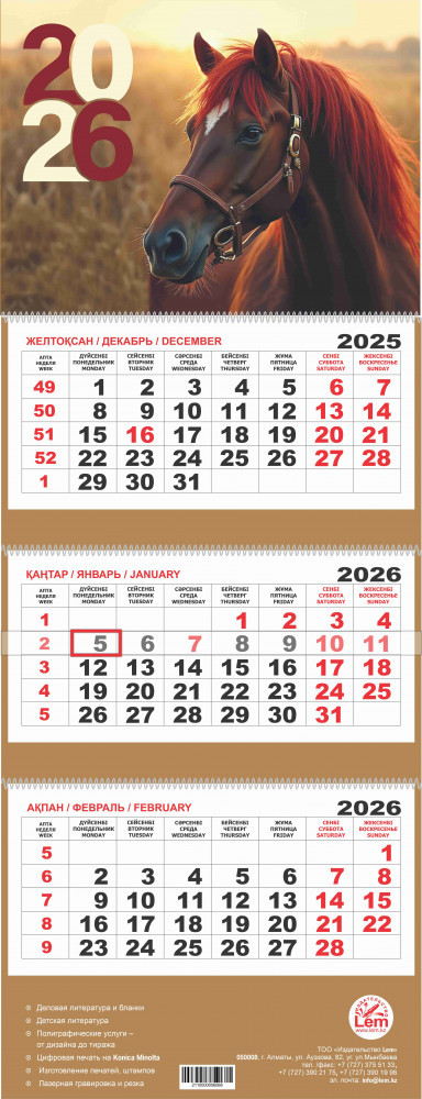 Квартальный настенный календарь РК на 2026 год «Год Лошади»новинка