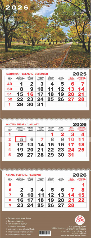 Календарь квартальный настенный с праздничными и выходными днями в РК на 2026 год. Из 3-х блоков по 12 страниц на пружине. Размер календаря 30 см на 80 см. Календарь имеет русский, английский, казахский языка. Имеется бегунок. |