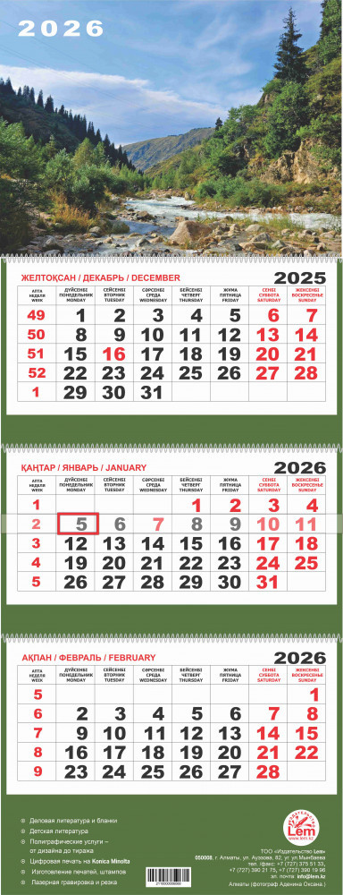 Календарь квартальный настенный с праздничными и выходными днями в РК на 2026 год. Из 3-х блоков по 12 страниц на пружине. Размер календаря 30 см на 80 см. Календарь имеет русский, английский, казахский языка. Имеется бегунок. |