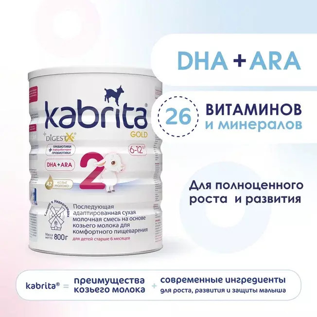 Kabrita® 2 GOLD — нежная молочная смесь на основе козьего молока для комфортного пищеварения для детей от 6 месяцев. Смесь Kabrita® 2 GOLD производится из полезного козьего молока с добавлением ценнейших сывороточных белков козьего молока, комплекса DigestX®, пребиотиков (ФОС, ГОС), пробиотиков (бифидобактерии Bifidobacterium BB-12®), DHA и ARA, нуклеотидов. Сбалансированный состав смеси Kabrita® 2 GOLD разработан для обеспечения ребенка питательными веществами, необходимыми для правильного физического и умственного развития и укрепления иммунитета. |