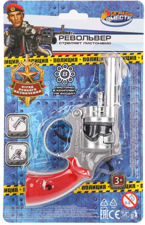 Револьвер для стрельбы пистонами «Полиция» ТМ «Играем вместе» непременно понравится юному герою. Игровое оружие с реалистичным звуком и лёгким дымовым эффектом станет любимой игрушкой вашего ребёнка. Револьвер легко заряжается и перезаряжается, нужно просто откинуть 8-зарядный барабан и установить кольцо с пистонами (приобретаются отдельно). На упаковке имеется схема установки пистонов. |