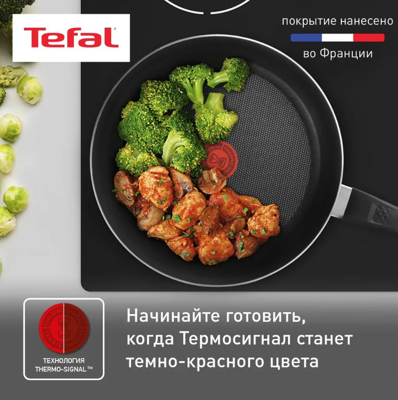 Сковорода с антипригарным покрытием Tefal Easy Plus нагревается быстро и равномерно, поэтому все ингредиенты обжариваются одинаково. Многослойное антипригарное покрытие нанесено во Франции и усилено титановыми частицами, благодаря чему выдерживает интенсивное использование на любых видах плит, включая газовую, стеклокерамику и электроплиту. Индикатор Тефаль Thermo-Signal становится полностью красным, когда сковорода достигает идеальной температуры для начала приготовления, а толстое дно посуды нагревается быстро и равномерно — без образования холодных или перегретых участков, гарантируя превосходное качество обжарки, текстуру, цвет и вкус.