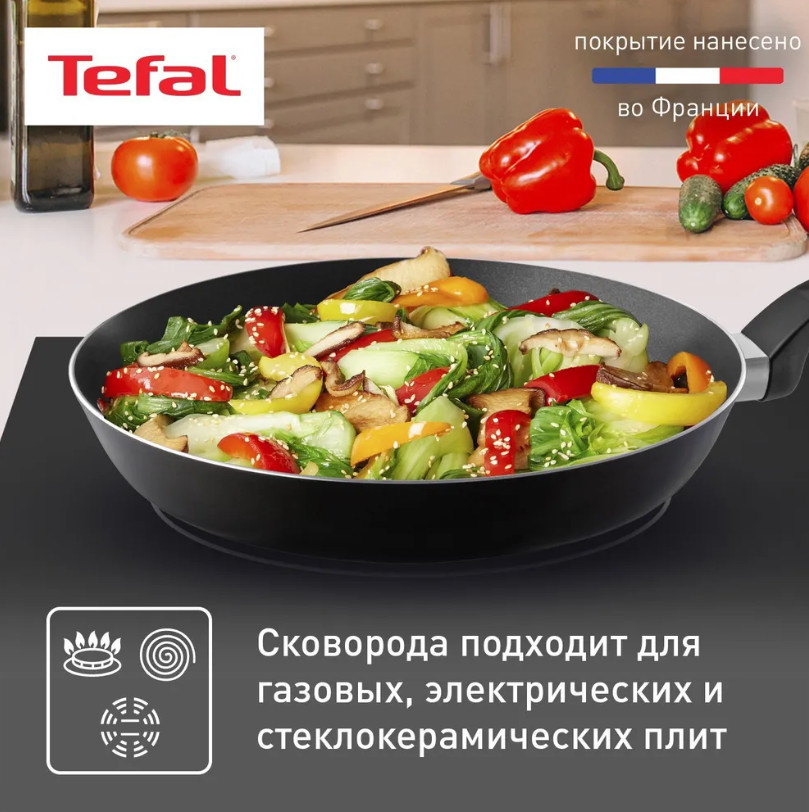 Кроме того, алюминиевая сковорода оснащена внутренним и внешним антипригарным покрытием для комфортного приготовления и легкой очистки, что поможет экономить время и силы на семейные застолья в дни рождения, Новый год, масленицу и другие праздники. Сковорода подходит для использования на газовых, электрических и стеклокерамических варочных панелях. Порадуйте себя и своих близких полной коллекцией из серии Easy Plus! Приготовьте любимые блюда или попробуйте новые рецепты — посуда Easy Plus от Tefal поможет добиться аппетитного результата!