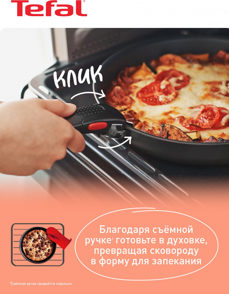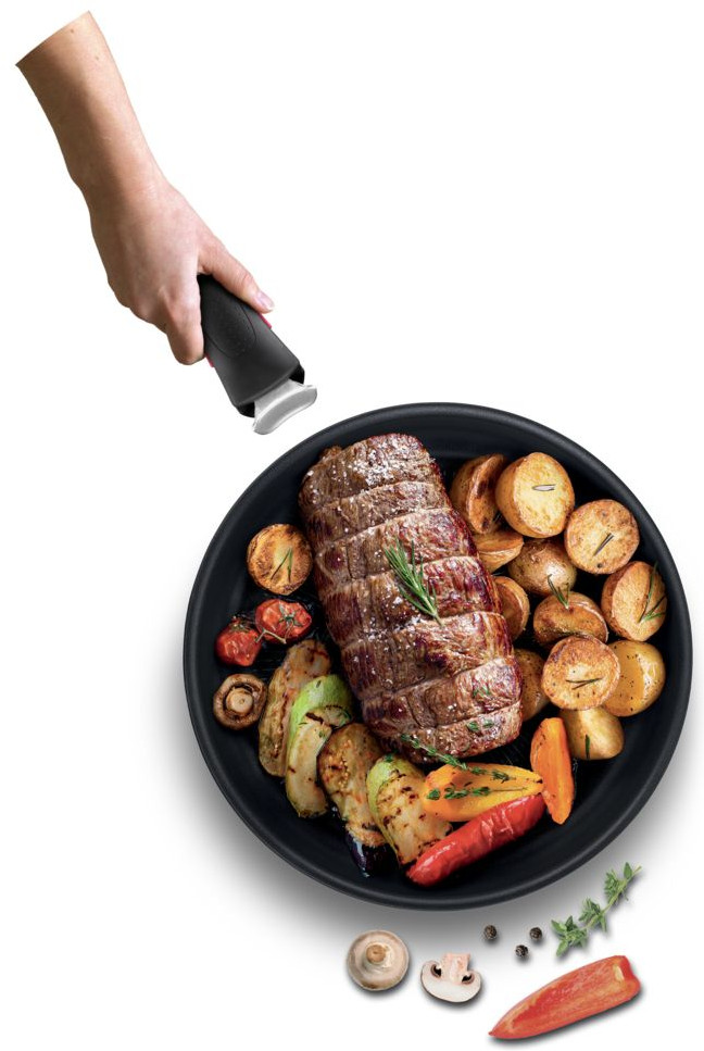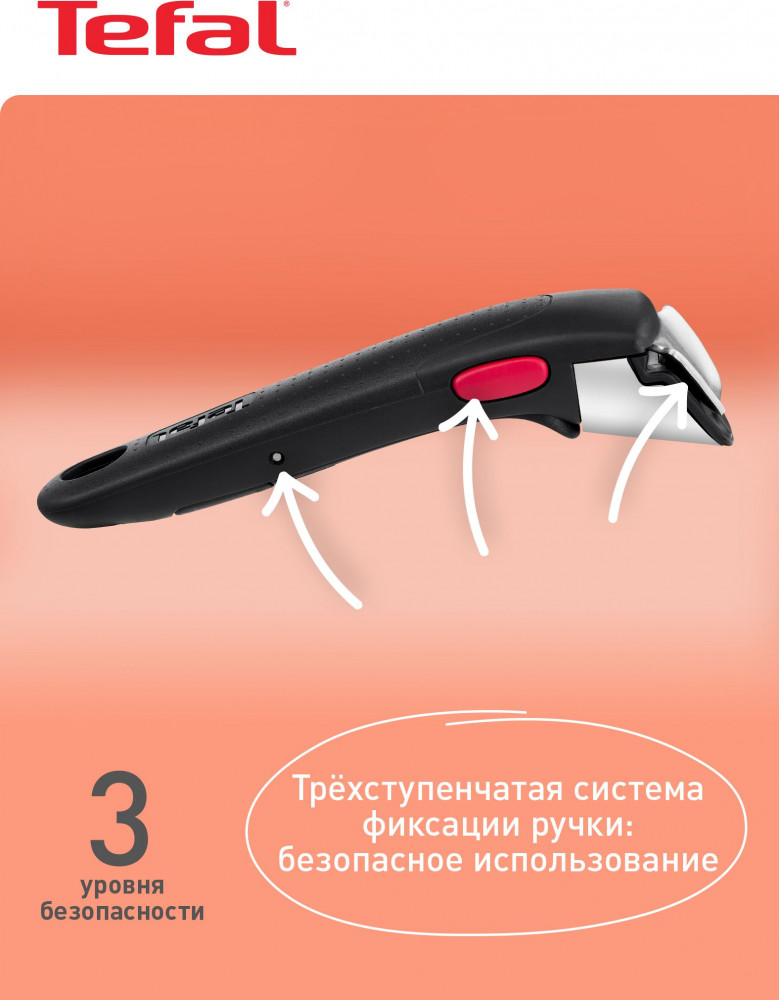 Серия: Ingenio Съемная ручка Tefal Ingenio — легко готовить, удобно хранить. Благодаря 3-ступенчатой системе фиксации запатентованная ручка Ingenio гарантирует дополнительную безопасность и дарит уверенность. Способна выдерживать нагрузку до 10 кг, безопасная и надежная конструкция ручки Ingenio подходит для интенсивного использования. Посуда Ingenio создана специально для того, чтобы сделать процесс приготовления пищи дома максимально легким. Приготовьте ингредиенты на плите, поставьте блюдо доготавливаться в духовку, а оставшуюся еду отправьте в холодильник прямо в посуде благодаря изящной съемной ручке. |