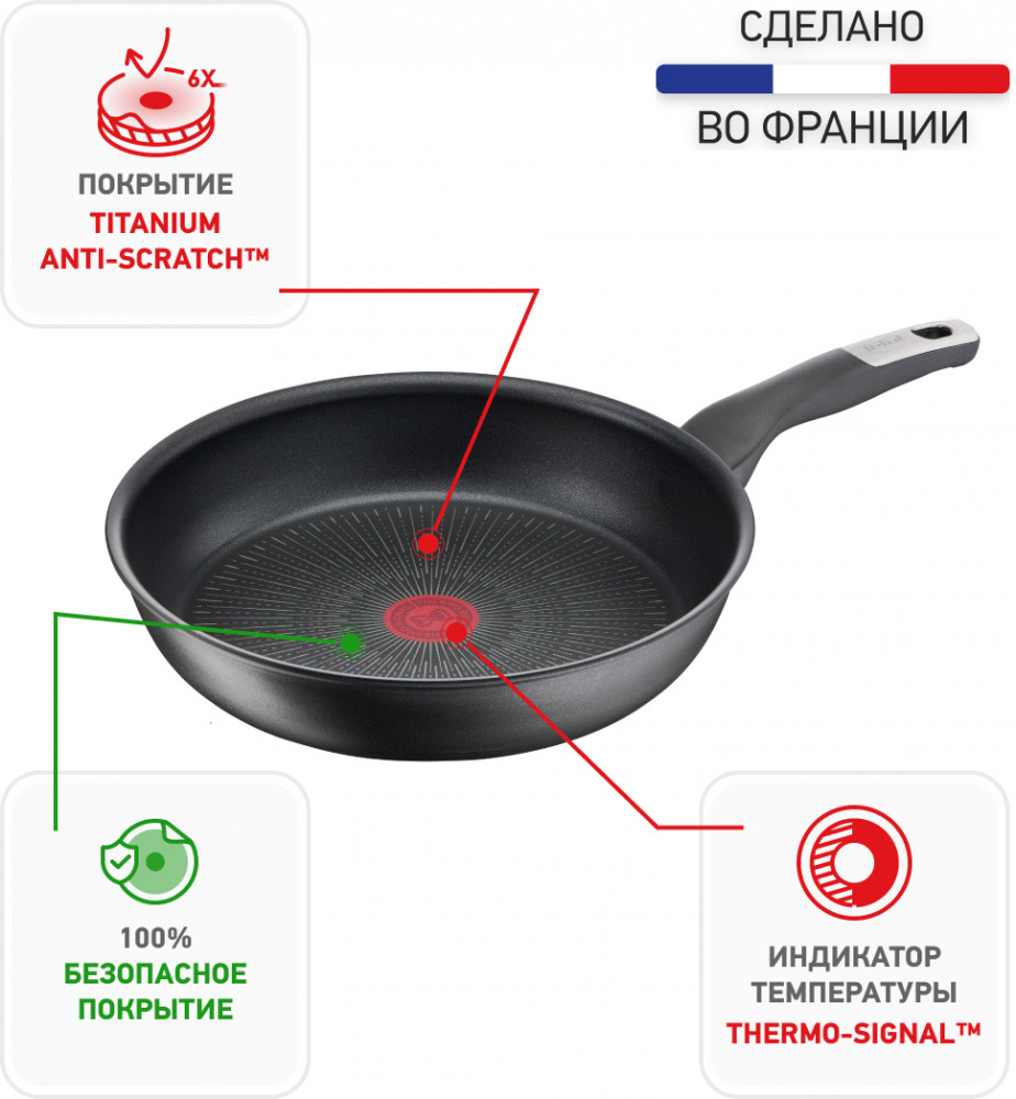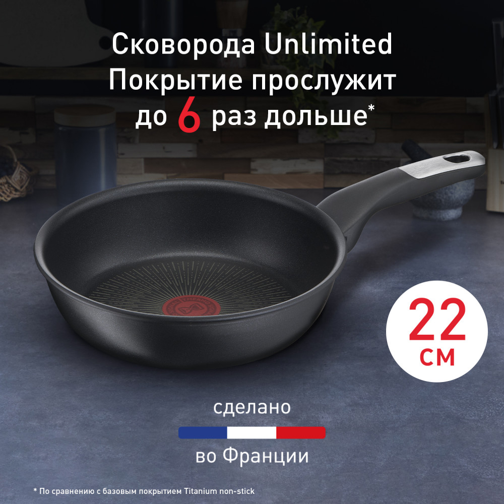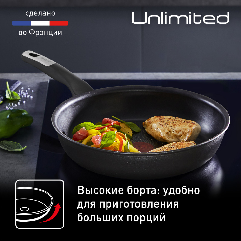 В сковороде Tefal Unlimited вы сможете готовить на конфорках любых видов, в том числе индукционных. Антипригарное покрытие Titanium предотвратит прилипание пищи и позволит использовать минимальное количество масла или даже обходиться без него. А ещё оно очень прочное — помешивайте блюдо или переворачивайте ломтики, используя аксессуары из любого материала, не опасаясь оставить царапины.