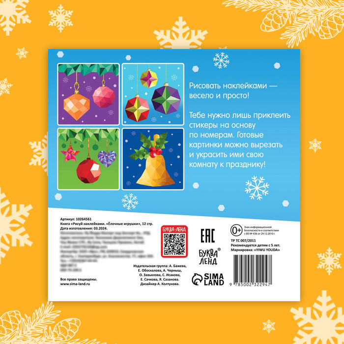 «Рисуй наклейками. Ёлочные игрушки» рекомендована для детей от 3 лет и станет отличным способом совместить игру с творчеством, подарив радость и малышу, и родителям. |