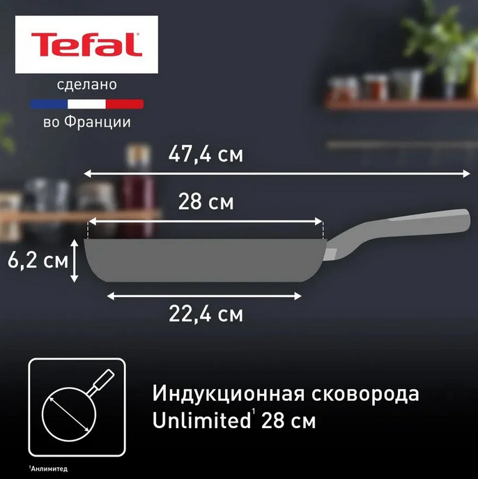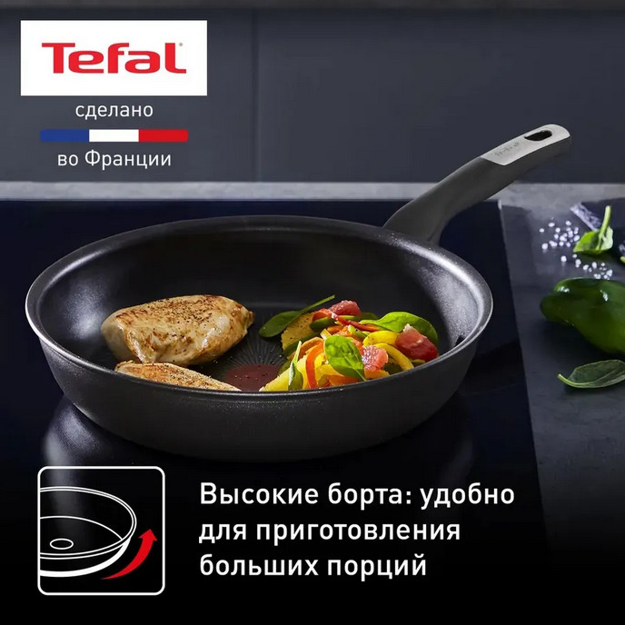 В сковороде Tefal Unlimited вы сможете готовить на конфорках любых видов, в том числе индукционных. Антипригарное покрытие Titanium предотвратит прилипание пищи и позволит использовать минимальное количество масла или даже обходиться без него. А ещё оно очень прочное — помешивайте блюдо или переворачивайте ломтики, используя аксессуары из любого материала, не опасаясь оставить царапины.