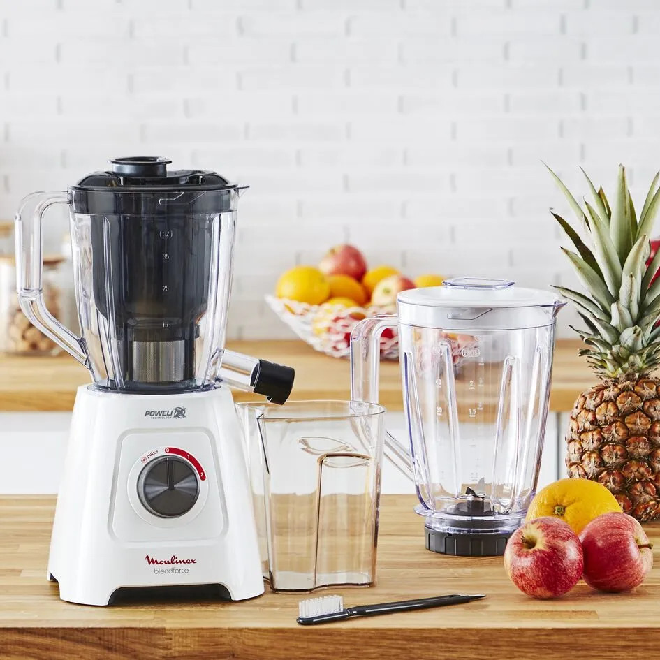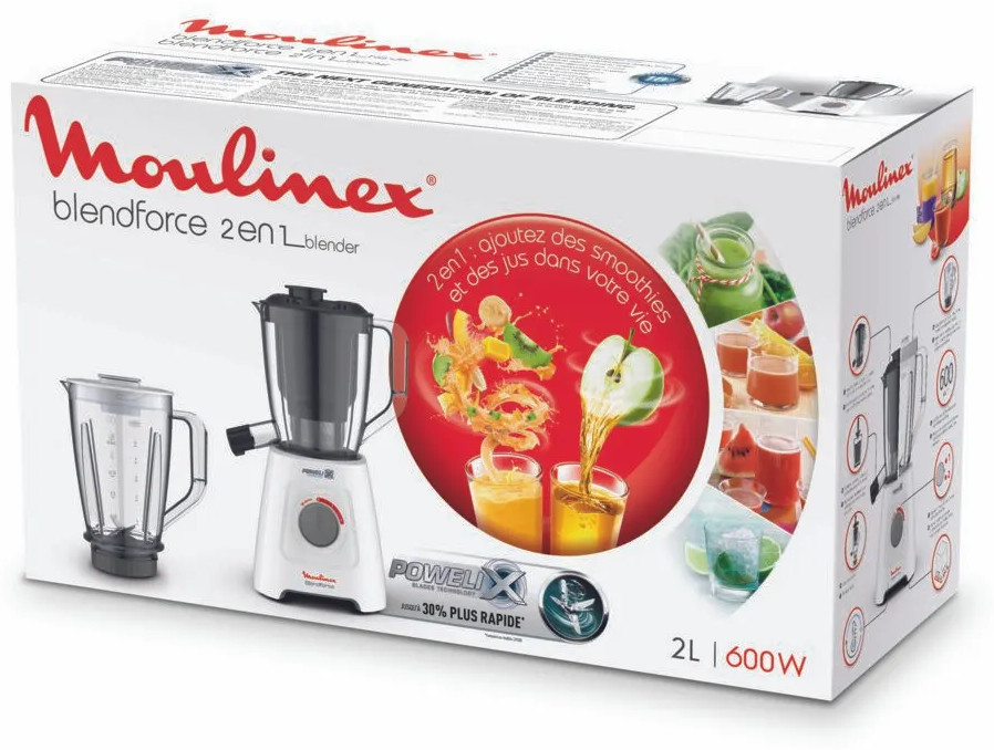 Серия: BlendForce Это идеальный способ побаловать себя натуральным свежевыжатым соком без мякоти и вкусным и полным витаминов смузи. Блендер оснащен мотором мощностью 600 Вт и ножом с 6 лезвиями, выполненными по технологии Powelix, которые обеспечивают моментальное измельчение ингредиентов до идеально однородной консистенции – без комочков и на 30% быстрее обычного блендера. Удобное управление двумя скоростями и импульсным режимом осуществляется с помощью эргономичной круглой ручки. Система охлаждения воздухом защищает мотор от перегрева во время работы, а после чаши и другие детали легко снимаются для удобной очистки. Откройте для себя бесконечное разнообразие вкусных и полезных напитков со стационарным блендером Moulinex Blendforce 2 в 1. |