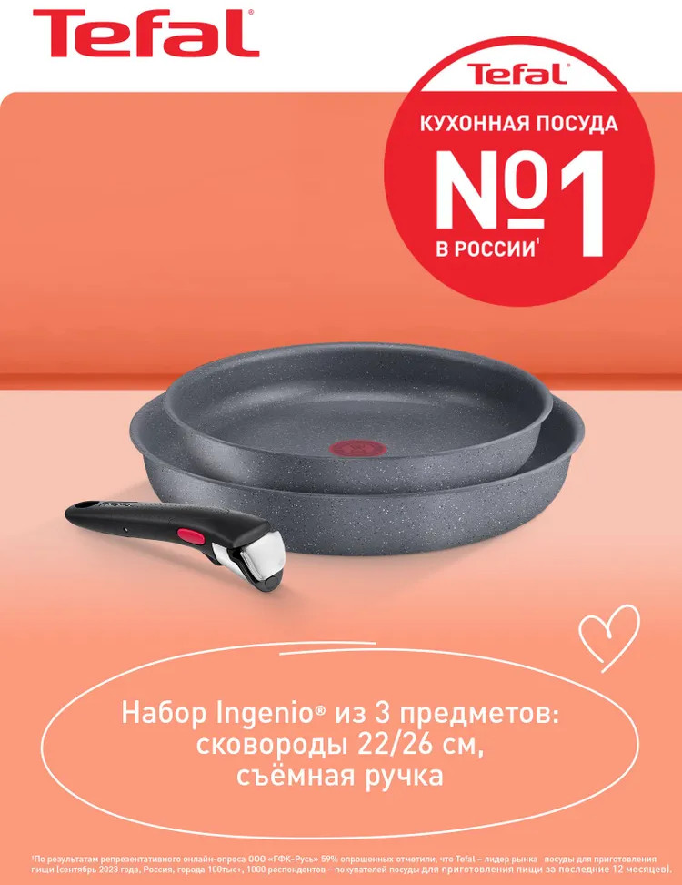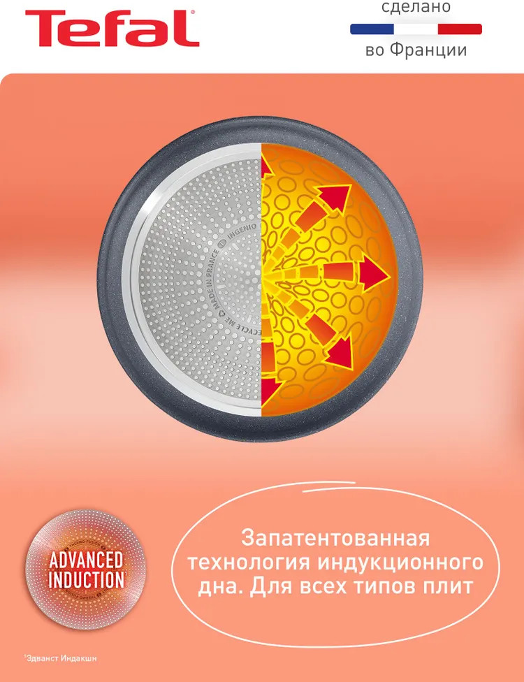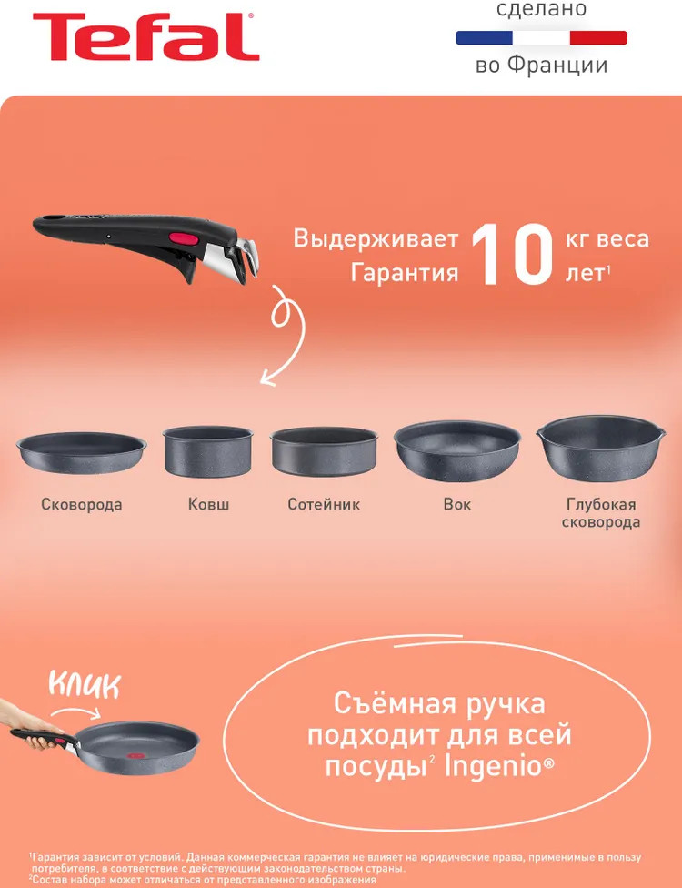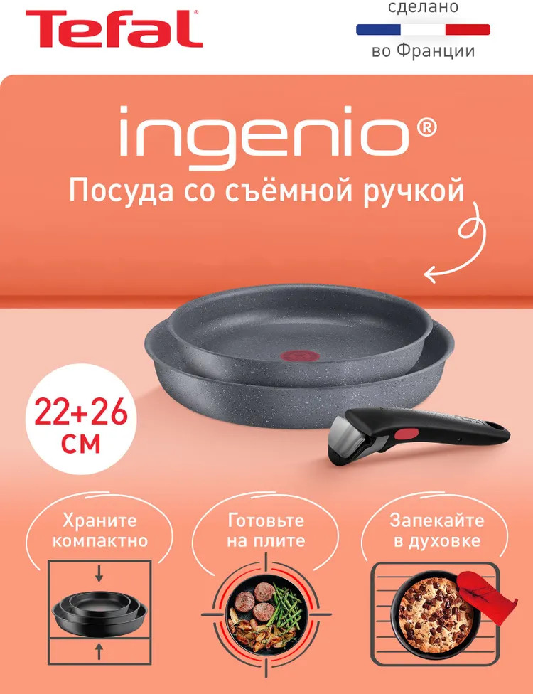 Съемная ручка легко отстегивается, что позволяет комфортно сложить ковши и сковороды в одну стопку. Посуда Ingenio компактно уместится в любом шкафу даже на самой маленькой кухне. Благодаря съемной ручке ваша сковорода превращается в форму для запекания любых блюд: гратена, лазаньи, тортов... Это ли не магия! Ведь можно готовить на плите сразу с несколькими ковшами и сковородами одновременно, используя одну съемную ручку.
