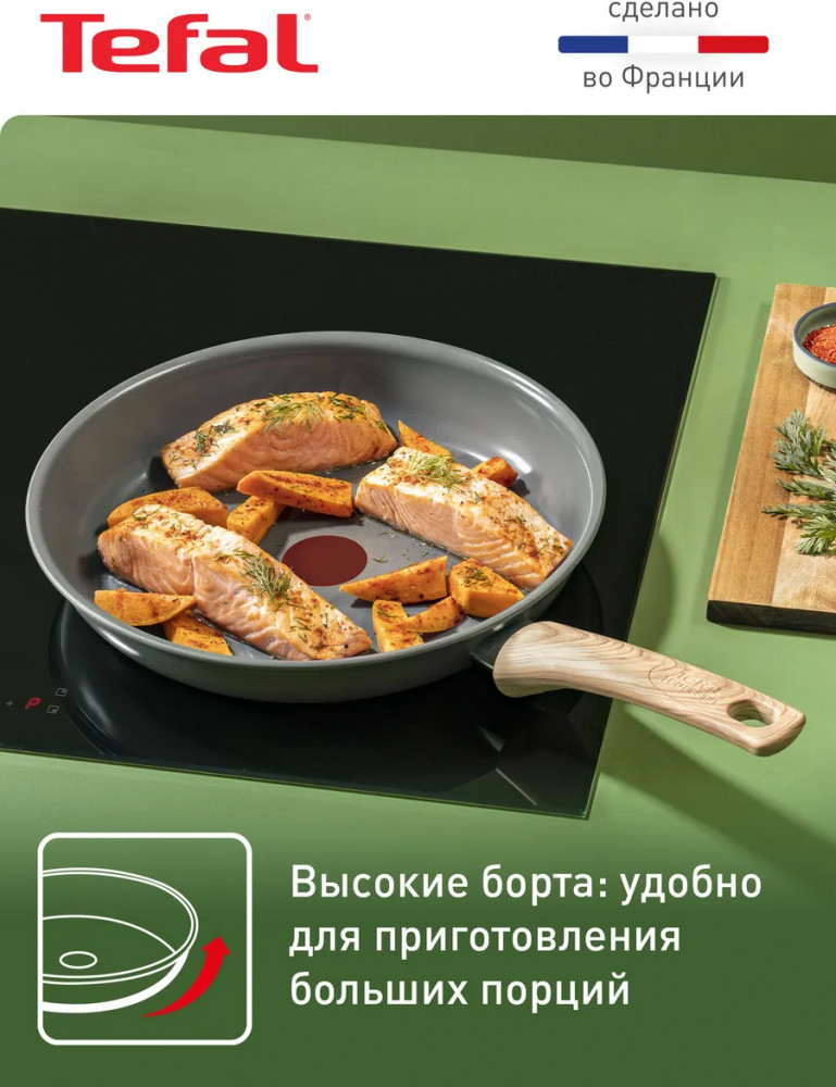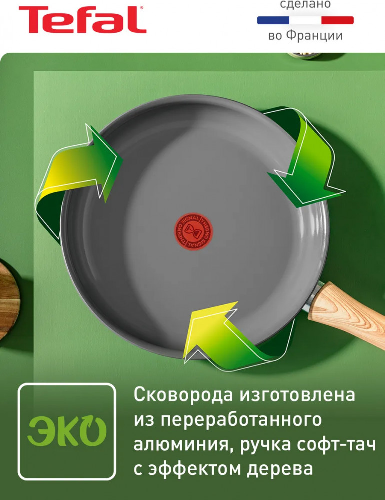 Наши инновационные продукты изготавливаются во Франции из высококачественных материалов под особым контролем. Алюминиевый корпус сковороды (Re)New изготовлен на 100% из переработанных материалов, а упаковка изделия создана на 90% из переработанного картона и пригодна для вторичной переработки. Благодаря высокому качеству антипригарного покрытия сковороду легко мыть после каждого приготовления пищи. Воплощение французского качества в современном дизайне с покрытием, стилизованным под дерево, и экологичной маркировкой на ручке изделия.
