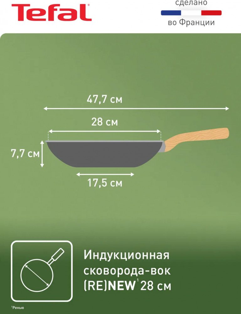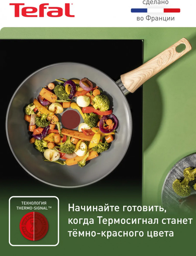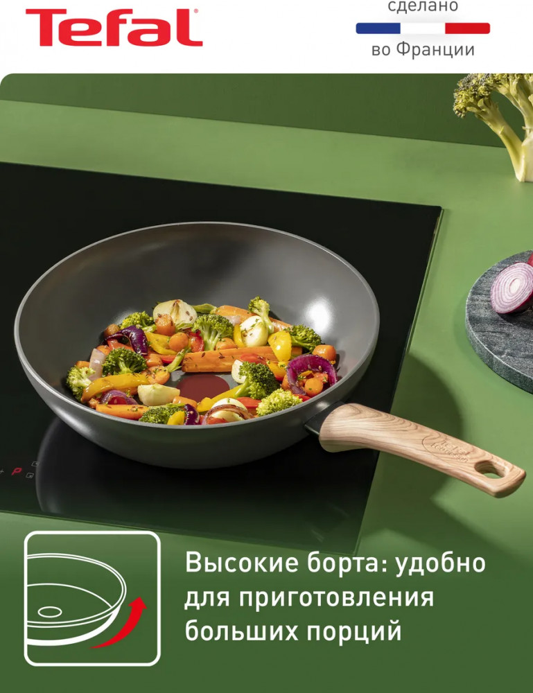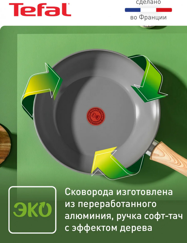 Наши инновационные продукты изготавливаются во Франции из высококачественных материалов под особым контролем. Алюминиевый корпус сковороды (Re)New изготовлен на 100% из переработанных материалов, а упаковка изделия создана на 90% из переработанного картона и пригодна для вторичной переработки. Благодаря высокому качеству антипригарного покрытия сковороду легко мыть после каждого приготовления пищи. Воплощение французского качества в современном дизайне с покрытием, стилизованным под дерево, и экологичной маркировкой на ручке изделия.