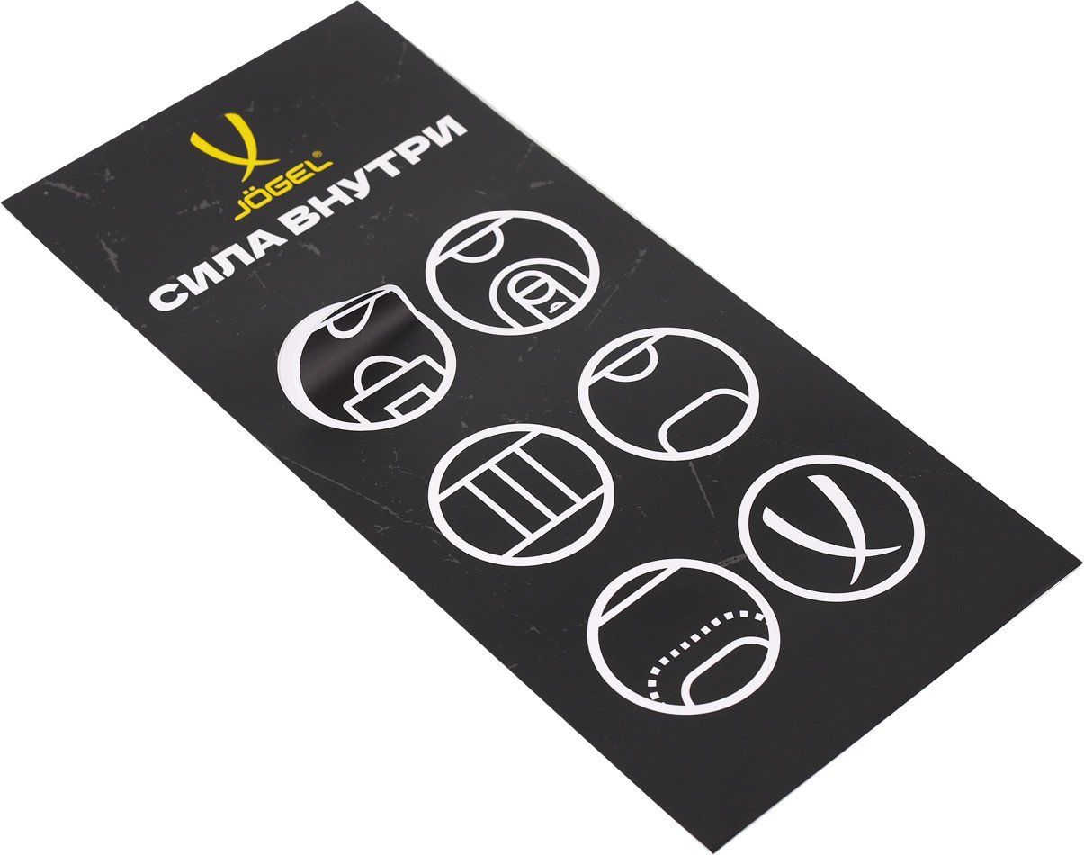 Сила внутри! А еще внутри каждой коробки с футзальными бутсами вы найдете стильные стикеры с изображениями командных видов спорта и логотипом Jögel. Их можно наклеить на любую ровную и гладкую поверхность, добавив индивидуальности своим аксессуарам.