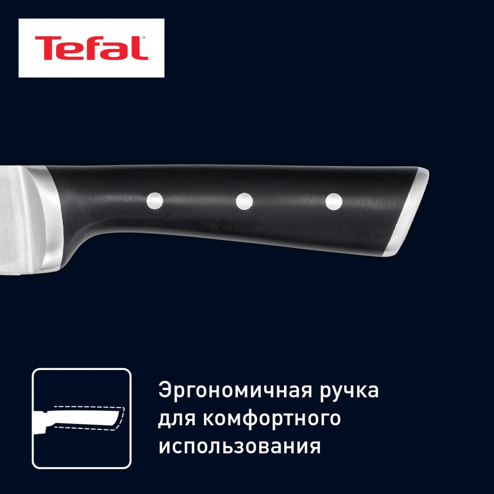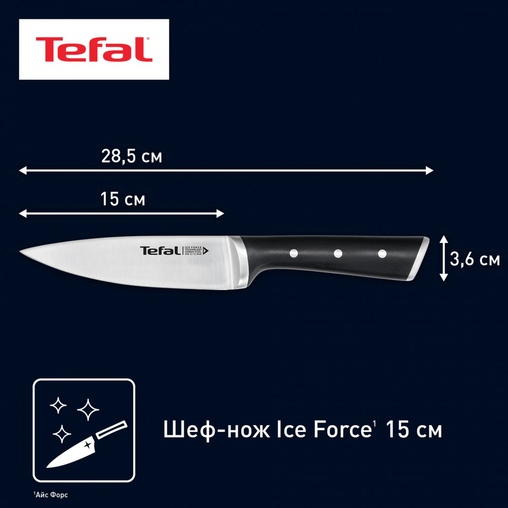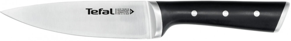 Шеф-нож Tefal Ice Force — это идеальный нож для профессионалов, который подходит для нарезки, шинковки и обработки различных продуктов. Длина 15 см делает его универсальным инструментом, идеальным для работы с мясом, овощами и другими ингредиентами. Нож выполнен из премиальной немецкой стали X50Cr15MoV, что обеспечивает долговечность и стойкость к повреждениям. Ледяная закалка лезвия до -120°C повышает прочность ножа, устойчивость к коррозии и позволяет лезвию оставаться острым на длительное время. Острое лезвие с характерной формой идеально подходит для точной нарезки и шинковки. Больстер из нержавеющей стали защищает руки и способствует удобному захвату ножа, а эргономичная рукоять с заклепками обеспечивает комфортное использование даже при длительных нарезках.