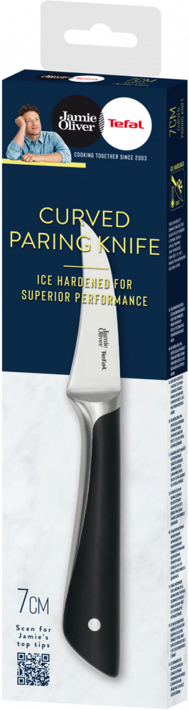 Нож для чистки овощей Tefal Jamie Oliver — это компактный нож с острым лезвием, который идеально подходит для работы с небольшими овощами и фруктами. Длина 7 см позволяет с лёгкостью справляться с тонкой очисткой и нарезкой. Нож выполнен из премиальной немецкой нержавеющей стали X50Cr15MoV, что гарантирует долговечность и стойкость к повреждениям. Ледяная закалка при −120°C повышает прочность лезвия, обеспечивая долговечную остроту. Эргономичная рукоять и больстер из нержавеющей стали обеспечивают надежность и удобство при использовании, а отличный баланс ножа помогает точно и безопасно работать с продуктами. Дизайн ножа был разработан совместно с известным шеф-поваром Джейми Оливером, что гарантирует не только функциональность, но и стильный внешний вид.
