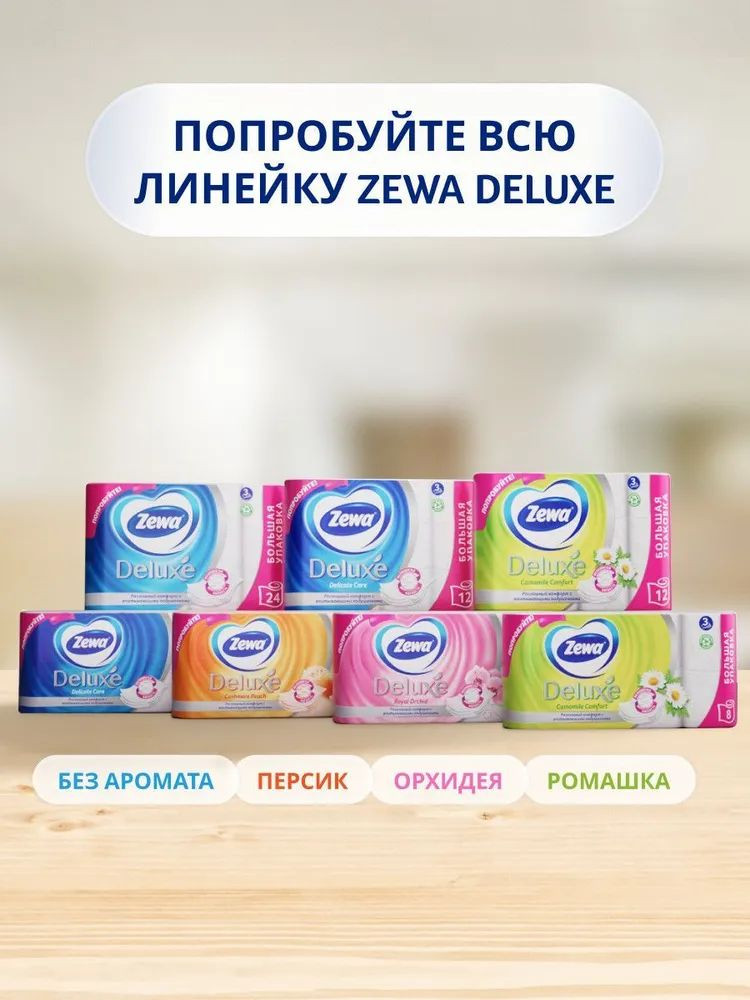 Туалетная бумага Zewa Deluxe — это идеальный помощник в обеспечении комфорта и чистоты в вашем доме. Упаковка содержит 24 рулона, что позволяет надолго забыть о необходимости часто обновлять запасы. Продукт состоит из трех слоев, что обеспечивает высокую прочность и впитывающую способность. Вы сможете быть уверены в том, что средство гигиены обеспечивает надежность в использовании.