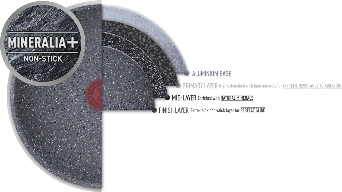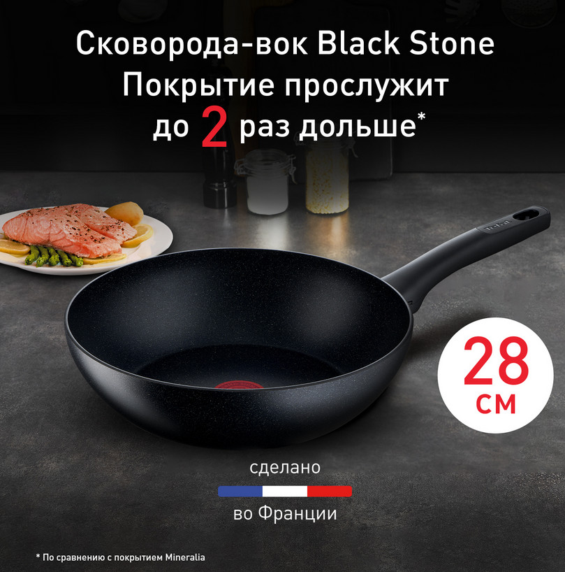 Посуда Tefal Black Stone сочетает в себе безупречное качество и долгий срок службы. Сковорода-вок имеет ультрапрочное антипригарное покрытие Mineralia+, которое усилено натуральными минералами и показывает исключительные антипригарные свойства даже спустя время. Попробуйте приготовить любимые восточные блюда дома и угостите ими ваших близких. Интенсивное перемешивание, приготовление на сильном огне, мытье жесткой щеткой... Современные кулинарные проблемы требуют современных решений — посуду, которая выдерживает проверку временем. Мы в Tefal верим в силу натуральных минералов, поэтому мы применили весь наш опыт, чтобы усовершенствовать антипригарное покрытие Mineralia+ для серии посуды Black Stone. Мы усилили покрытие ультрапрочными минералами и придумали новую, уникальную конструкцию посуды, благодаря чему она выдерживает интенсивное обращение.