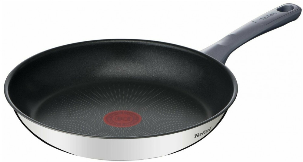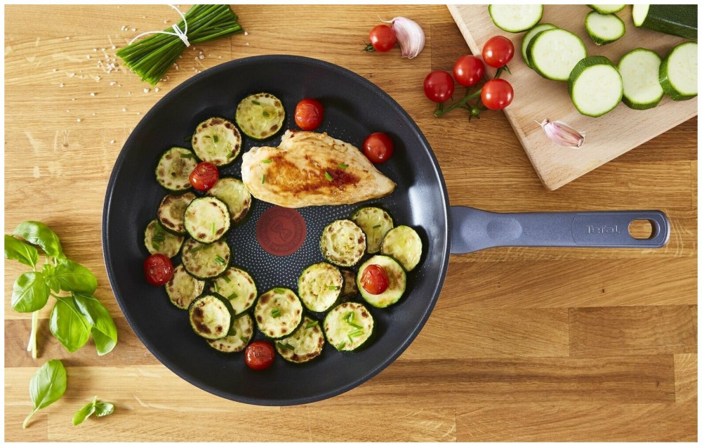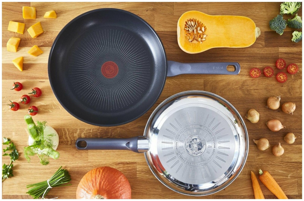 Сковорода выдерживает самые экстремальные способы приготовления и помогает создавать кулинарные шедевры на вашей кухне. Готовьте так, как вам нравится: надежная, долговечная и удобная посуда для кухни имеет 10-летнюю гарантию на лучшее качество нержавеющей стали и экспертное производство. Заклепочное крепление ручки алюминиевой сковороды гарантирует надежное и безопасное использование сковороды, а антипригарное покрытие Tefal создано, чтобы служить безупречно при ежедневной эксплуатации. Благодаря титановым частицам поверхности, покрытие сохраняет отличные антипригарные свойства до 2-х раз дольше по сравнению с стандартным покрытием Tefal Titanium. Посуда подходит для использования на газовых, электрических, стеклокерамических и индукционных плитах. Уникальный индикатор температуры Thermo-Signal вовремя подскажет, когда кухонный инвентарь нагрелся до оптимальной температуры для начала приготовления.