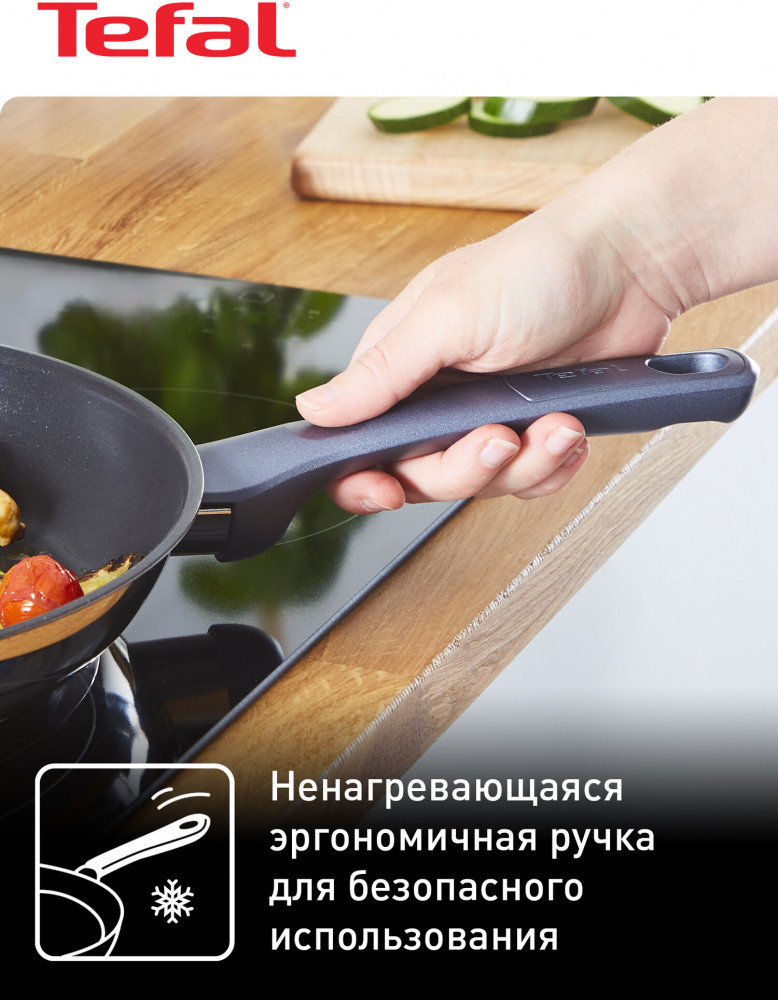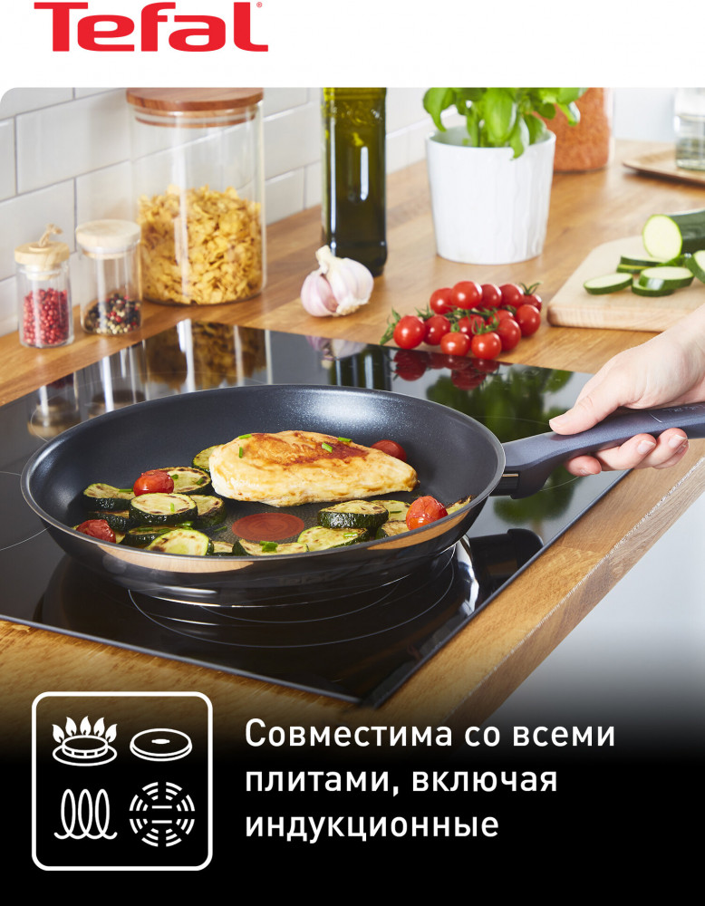 Сковорода выдерживает самые экстремальные способы приготовления и помогает создавать кулинарные шедевры на вашей кухне. Готовьте так, как вам нравится: надежная, долговечная и удобная посуда для кухни имеет 10-летнюю гарантию на лучшее качество нержавеющей стали и экспертное производство. Заклепочное крепление ручки алюминиевой сковороды гарантирует надежное и безопасное использование сковороды, а антипригарное покрытие Tefal создано, чтобы служить безупречно при ежедневной эксплуатации. Благодаря титановым частицам поверхности, покрытие сохраняет отличные антипригарные свойства до 2-х раз дольше по сравнению с стандартным покрытием Tefal Titanium. Посуда подходит для использования на газовых, электрических, стеклокерамических и индукционных плитах. Уникальный индикатор температуры Thermo-Signal вовремя подскажет, когда кухонный инвентарь нагрелся до оптимальной температуры для начала приготовления.