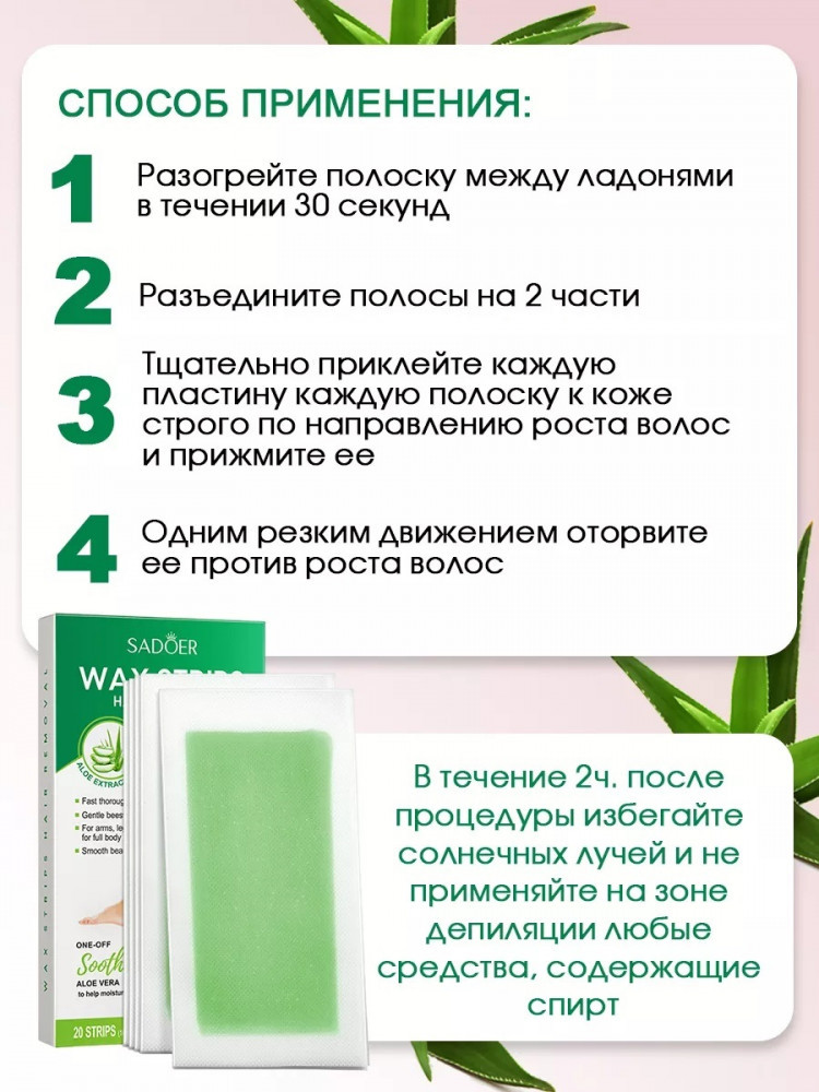 SADOER Восковые полоски для депиляцииВ данный момент этот товар отсутствует в продаже. Возможно, у нас найдется аналогичный или похожий товар здесь. Восковые полоски для депиляции Sadoer — это надежный и эффективный способ избавиться от нежелательных волос на теле за считанные минуты. Каждая полоска покрыта высококачественным воском, который обеспечивает бережное удаление волос даже с корнями. Продукт идеально подходит для использования как в домашних условиях, так и в салоне красоты. Удобная упаковка содержит достаточное количество полосок для проведения нескольких процедур депиляции. |