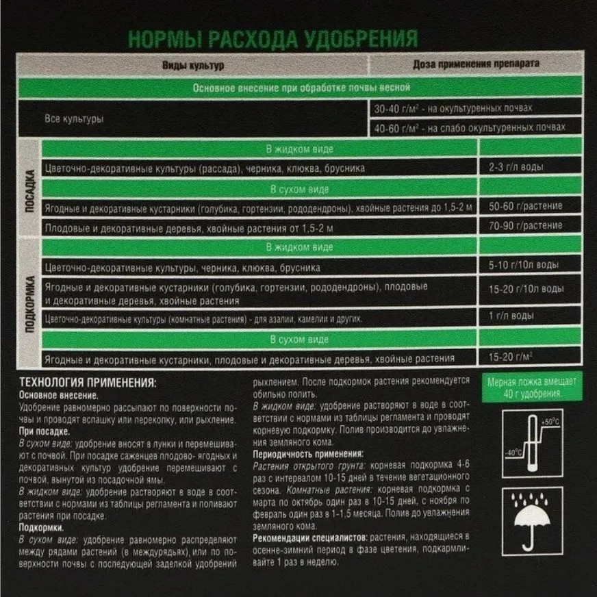 Основное внесение при посадке: удобрение внести в лунки. Почву и удобрение обязательно перемешать. Норма расхода: голубика, гортензии, рододендроны, хвойные растения до 1,5-2 м — 50-60 г/растение, плодовые и декоративные деревья, хвойные растения от 1,5-2 м — 70-90 г/растение.