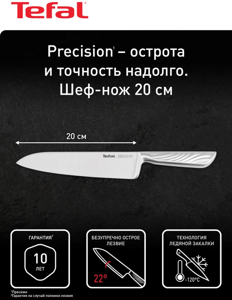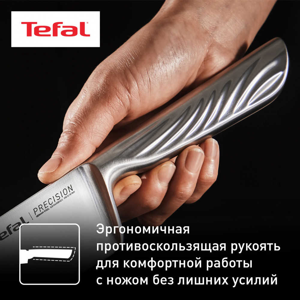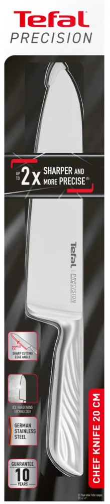 Шеф-нож Tefal Precision 20 см — идеальный выбор для универсального использования: от нарезки мяса и рыбы до шинковки овощей и рубки зелени. Длина лезвия 20 см позволяет справляться с крупными объёмами и разными типами продуктов. Он изготовлен из прочной нержавеющей стали X50Cr15MoV, закалённой по технологии ледяной обработки при -120 °C, что делает лезвие прочным, устойчивым к коррозии и долго сохраняющим остроту. Угол заточки 22° обеспечивает легкость реза и аккуратные срезы. Цельная конструкция ножа и удобная эргономичная рукоять дают уверенный контроль и надёжный хват. Ножи серии Precision имеют 10 лет гарантии на лезвие, что подтверждает их надёжность и качество. Серия Tefal Precision — ваш союзник в точности, комфорте и долговечности на кухне.