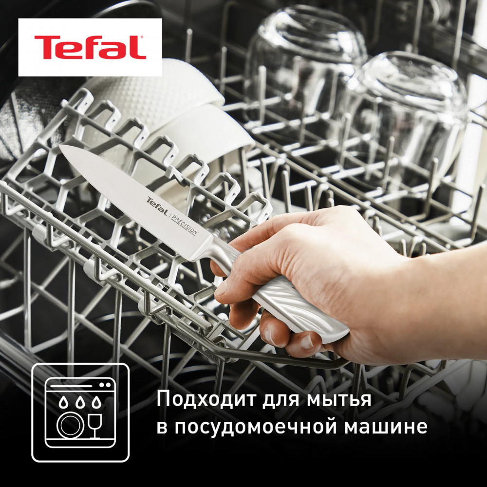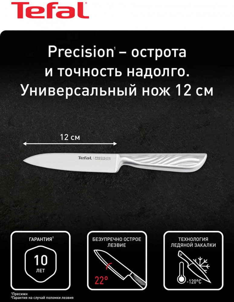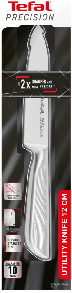 Универсальный нож Tefal Precision — незаменимый инструмент для повседневной кухни. Лезвие длиной 12 см удобно для нарезки колбасы, сыра, фруктов и других небольших ингредиентов. Нож выполнен из премиальной нержавеющей стали X50Cr15MoV, прошедшей процедуру ледяной закалки при −120 °C. Это гарантирует высокую стойкость к коррозии, износостойкость и сохранение остроты на долгий срок. Угол заточки 22° позволяет получать аккуратные и точные срезы. Цельный корпус и эргономичная рукоять обеспечивают удобный хват и максимальный контроль во время работы. Ножи серии Precision имеют 10 лет гарантии на лезвие — символ качества и надежности бренда. Tefal Precision — серия, созданная для тех, кто хочет готовить уверенно и точно.