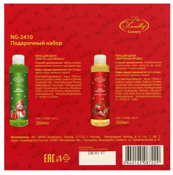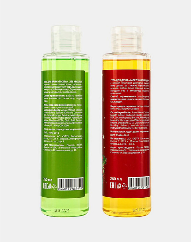 Подарочный набор Liss Kroully включает два отличных средства для ухода за телом, которые помогут создать атмосферу уюта и праздника в новогоднюю ночь: гель для душа и пену для ванны. Гель нежно очищает кожу, оставляя её увлажнённой и гладкой. Он подходит для ежедневного использования, обеспечивая свежесть и комфорт на протяжении всего дня. Пена для ванн создаёт нежную и ароматную пену, которая погружает в атмосферу уюта и расслабления. Идеально подходит для вечернего релакса и наполнит ванну приятным ароматом, который долго остаётся на коже. Этот набор станет отличным подарком на Новый год. Он дарит не только ухоженную кожу, но и атмосферу расслабления и наслаждения. Составьте идеальный праздничный момент с этим набором!