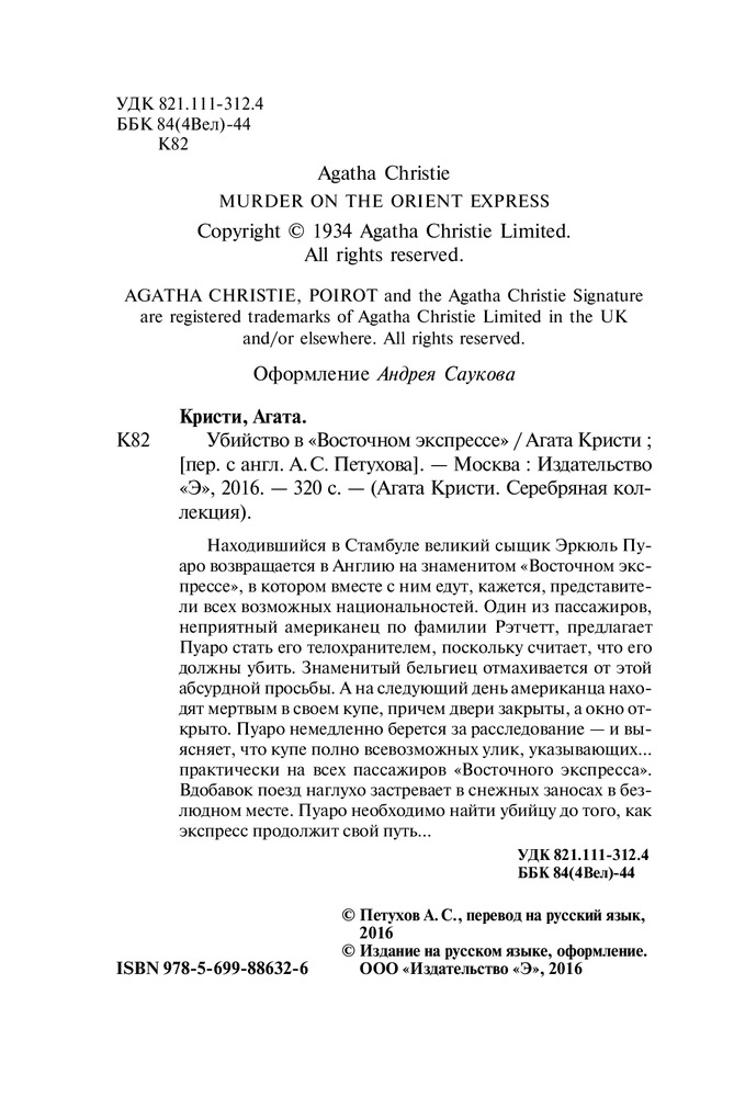 Пора и мне написать, что ль)) Не важно качество книги (если уж интересно, то об этом написали ниже) Ниже - это туть. Листы серые, но плотные, из книги не выпадают. Обложка мягкая, да, но в твёрдом переплёте я этого не представляю. Шрифт крупный, оформление просто *звук поцелуя* Смотрела фильм, так что все уже знала. Стало интересно, как выглядит это в книге. Книга и фильм просто офигенно дополняют друг друга, по крайней мере в моей голове. Фильм смотрела таки давно... В книге Касетти старикан, а в фильме это Джонни Депп и... Эм, не сложилось *печальная улыбочка* Пуаро моя новая звездочка. Офигенный детектив. Ой, а какие там шуточки, я смеялась. Хотя, наверное, их там и не было... Но я смеялась))) Взять хоть те слова: -Страшна, как смертный грех! Но какая личность! На этом, пожалуй, все))