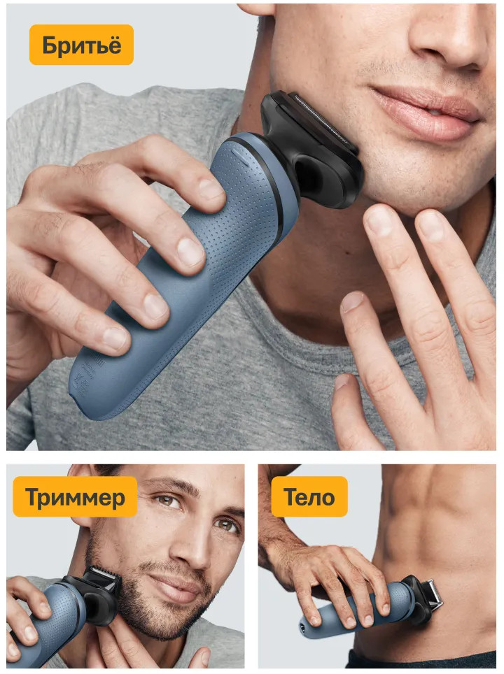 Меняйте с легкостью свою бритву под любую потребность. Эргономичная изогнутая форма и идеальное расположение точек касания интерфейса обеспечивают идеальный захват в любой ситуации. Литий-ионный аккумулятор обеспечивает до 3 недель бритья и имеет функцию быстрой 5-минутной зарядки. Бритвы данной серии 100% водонепроницаемые и предназначен для сухого бритья, с пеной, гелем и в душе.
