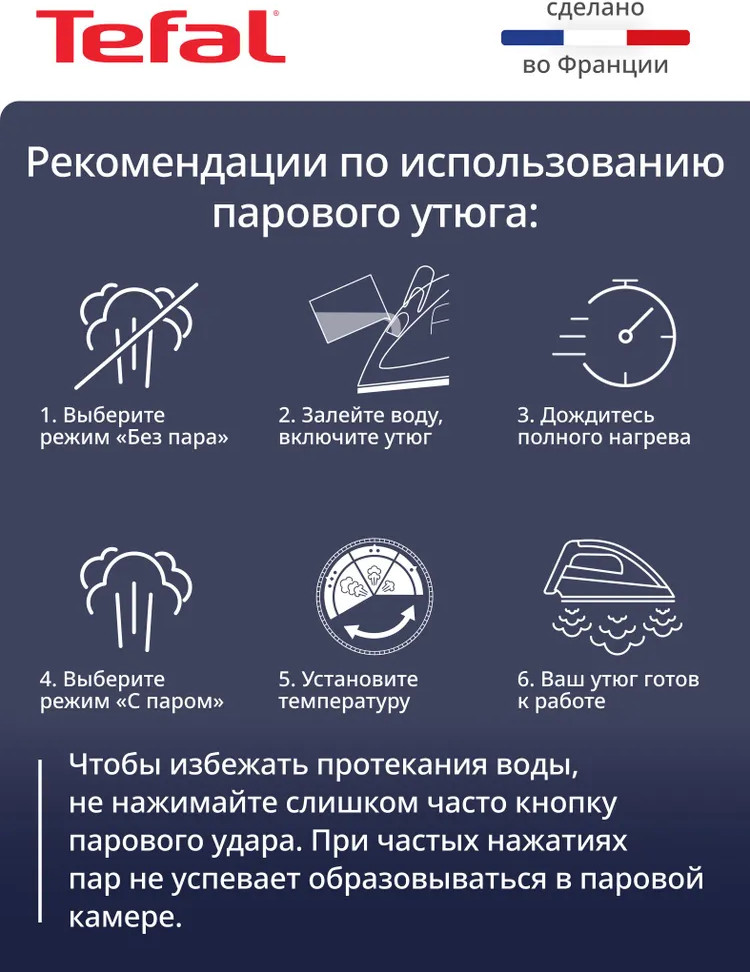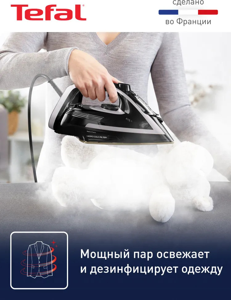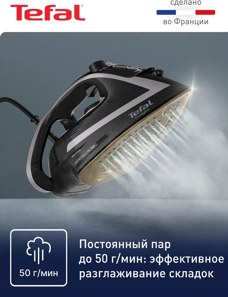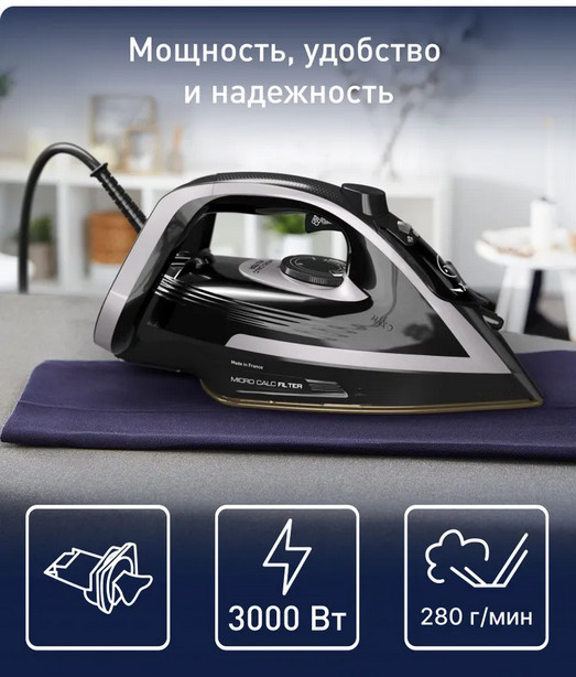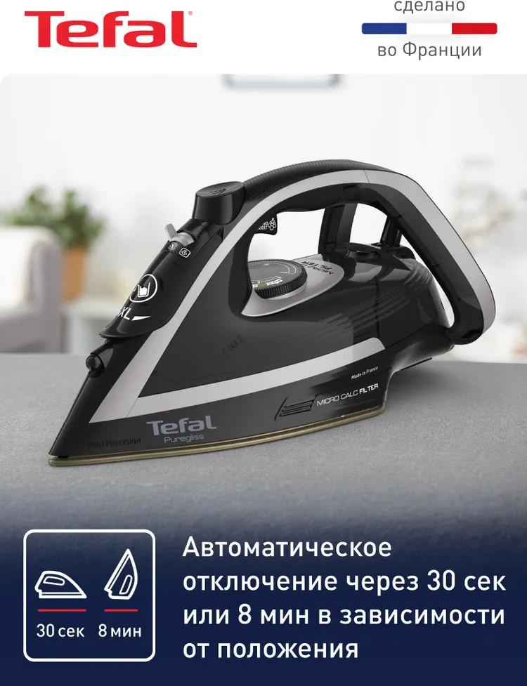 Подарите своим вещам уход, которого они действительно достойны вместе с Puregliss. Этот мощный и производительный утюг способен справиться со складками и заломами на любой ткани и оснащен системой Micro Calc Filter, которая удерживает накипь, защищая вашу одежду и домашний текстиль от образования пятен во время глажения Насладитесь настоящим европейским качеством — утюг разработан и произведен во Франции и остается ремонтопригодным в течение целых 15 лет. Запатентованная технология Micro Calc Filter удерживает накипь, защищая вашу одежду и домашний текстиль от образования пятен во время глажения Оптимально распределяет пар по ткани и превосходно скользит В вертикальном положении при бездействии утюг выключится через 8 минут. В горизонтальном положении при бездействии утюг выключится через 30 секунд. Высокая температура пара уничтожает до 99.99% бактерий
