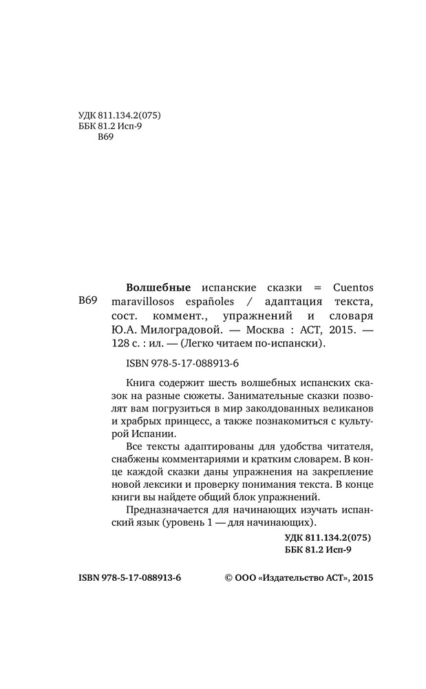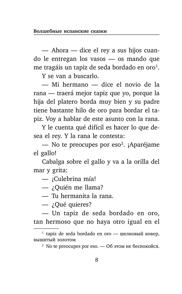 Волшебные испанские сказкиВ данный момент этот товар отсутствует в продаже. Возможно, у нас найдется аналогичный или похожий товар здесь. Серия: Легко читаем по-испански Книга содержит шесть волшебных испанских сказок на разные сюжеты. Занимательные сказки позволят вам погрузиться в мир заколдованных великанов и храбрых принцесс, а также познакомиться с культурой Испании. |