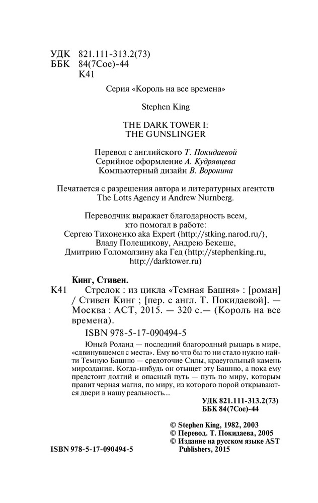 Купил по рекомендации друзей. Скажу честно, "Тёмная башня" не зацепила. Сюжет сложный (но только из-за того что это только начало, в цикле 8 книг), качество книги среднее. Но концовка очень интригует. Сейчас под вопросом заказывать дальше или забросить... Рекомендую заядлым поклонникам Кинга. Спасибо магазину!