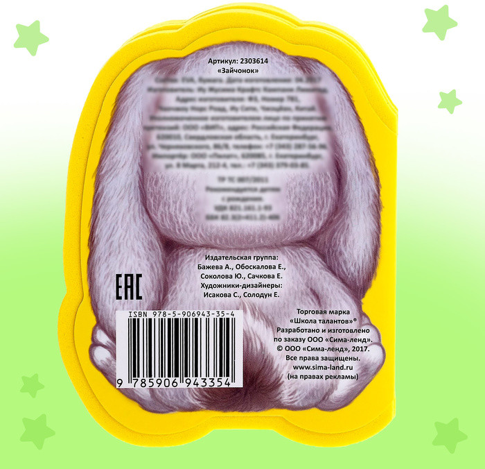 Зайчонок. Мягкая книгановинка В данный момент этот товар отсутствует в продаже. Возможно, у нас найдется аналогичный или похожий товар здесь. Серия: Книги из EVA Мягкая книга сделана из приятного на ощупь пористого материала EVA. На каждой странице приклеены яркие иллюстрации с милыми зверятами, которые понравятся малышу. У книги нет острых углов, она лёгкая, поэтому она безопасная даже для самых маленьких деток. Рекомендуем не мочить книгу, так как картон, приклеенный на EVA-основу не влагостойкий. С мягкой книгой малыш получит свои первые знания об окружающем мире и животных, которые в нём обитают. Рекомендована для чтения взрослыми детям с рождения. |
