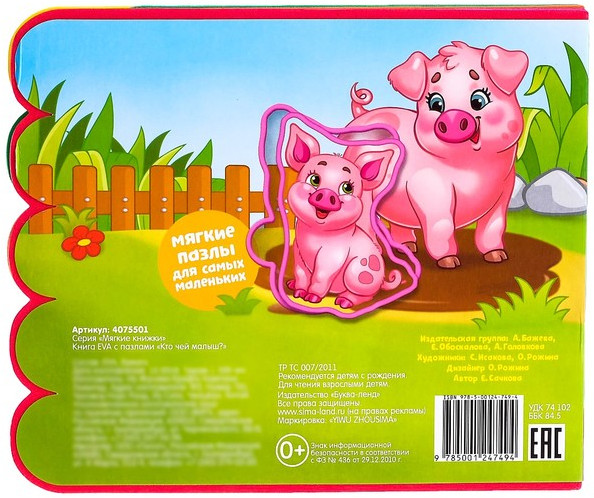 В данный момент этот товар отсутствует в продаже. Возможно, у нас найдется аналогичный или похожий товар здесь. Серия: Книги из EVA Мягкая книга-пазл «Кто чей малыш?» станет первым шагом малыша в увлекательное путешествие по миру животных. Изготовленная из безопасного пористого материала EVA, она идеально подходит для детей с рождения и помогает познакомиться с животными через яркие иллюстрации и интерактивные элементы.