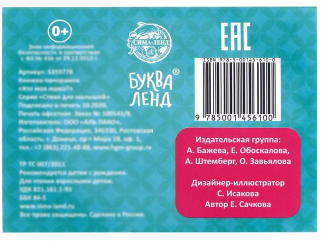 Кто моя мама? 3D Книжка-панорамкановинка В данный момент этот товар отсутствует в продаже. Возможно, у нас найдется аналогичный или похожий товар здесь. Серия: Книги-панорамки Книга-панорамка сделана из картона, а внутри на каждом развороте есть 3D-иллюстрации, которые оживят рассказы. В книге 5 разворотов. Добрые рассказы и милые герои с картинок понравятся малышу и помогут привить любовь к чтению. Рекомендовано для чтения взрослым и детям с рождения. |