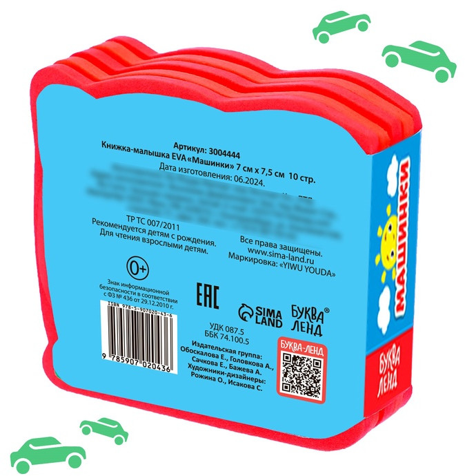 Машинки. Мягкая книжка-малышкановинка В данный момент этот товар отсутствует в продаже. Возможно, у нас найдется аналогичный или похожий товар здесь. Серия: Книги из EVA Мягкая книга сделана из приятного на ощупь пористого материала ЭВА. На каждой странице приклеены яркие иллюстрации с милыми персонажами, которые непременно понравятся малышу. С этой книгой малыш узнает, какой бывает транспорт и по каким дорогам он ездит. У издания нет острых углов, оно лёгкое, поэтому безопасно даже для самых маленьких деток. Рельефные края книги и объёмная кабинка-голова грузовичка помогут лучше заинтересовать юного читателя поскорее познакомиться с историей. Рекомендуем не мочить книгу, так как картон, приклеенный на ЭВА-основу, невлагостойкий. Издание предназначено для чтения взрослыми детям с рождения. |