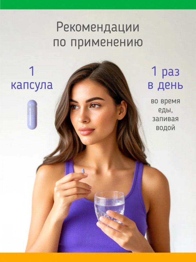 Способ применения: взрослым по 1 капсуле в день во время еды. Продолжительность приёма: 1 месяц. При необходимости приём можно повторить. Возможны повторные приёмы в течение года.