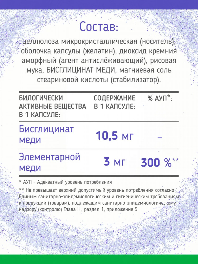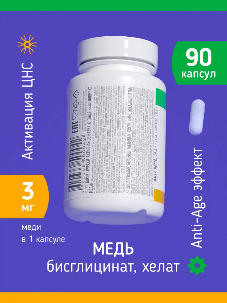 Хелат меди — это комплекс, который содержит медь в форме, которая легко усваивается организмом. Этот хелат помогает восполнить недостаток меди и предотвратить развитие различных заболеваний, связанных с ее дефицитом. Преимущества формы бисглицината — хелатная форма (бисглицинат) обеспечивает высокую биодоступность и хорошую переносимость, минимизируя риск побочных эффектов со стороны ЖКТ. Медь — это важный элемент, который играет ключевую роль в нашем организме. Она помогает поддерживать здоровье кожи, волос и ногтей, а также способствует нормальной работе сердца и сосудов. Однако, многие люди испытывают дефицит меди из-за неправильного питания или других факторов. Именно поэтому мы предлагаем вам уникальный продукт — медь бисглицинат.