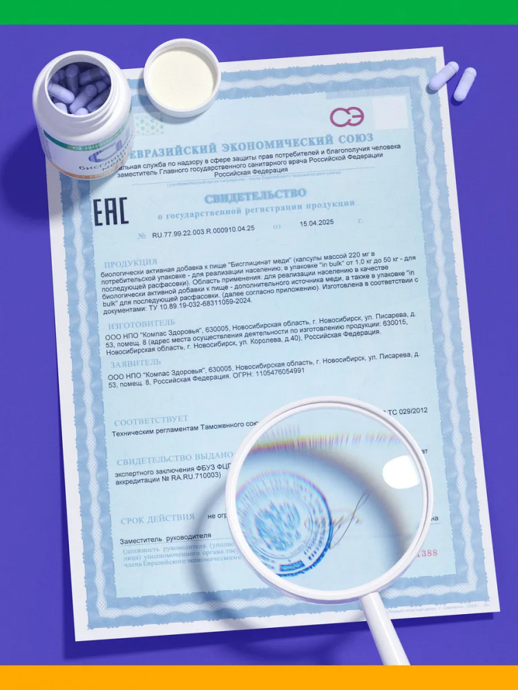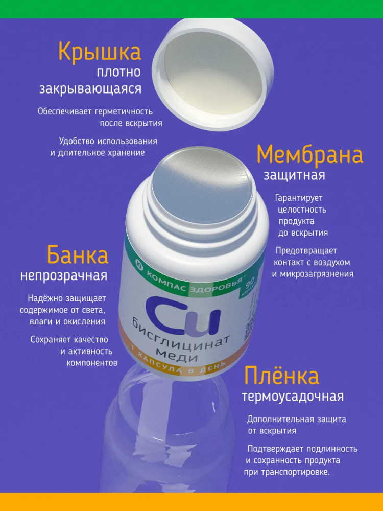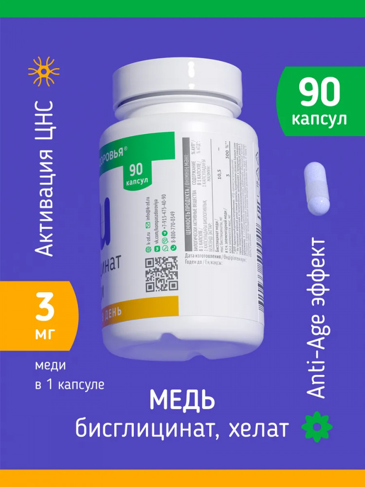 Медь бисглицинат 90 капсул от «Компас Здоровья» — эффективная поддержка иммунитета и обмена веществ. Медь — незаменимый микроэлемент, который участвует в ключевых процессах организма. Медь Бисглицинат в хелатной форме от «Компас Здоровья» обеспечивает максимальную усвояемость и биодоступность, способствуя: