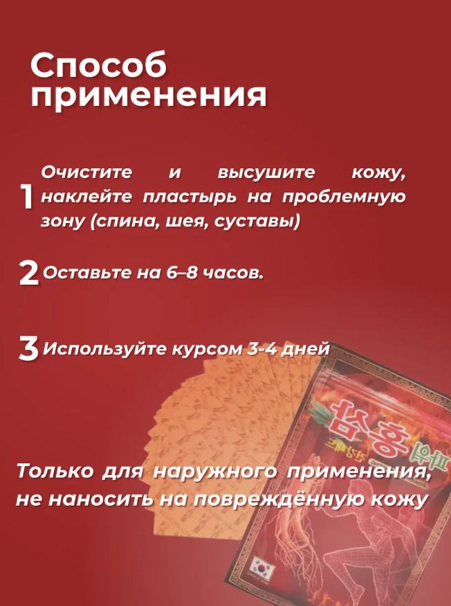 Корейский согревающий пластырь Power Red Ginseng с красным женьшенем способствует восстановлению организма, глубоко проникает и мгновенно снимает боль, улучшает кровообращение всего организма, эффективен при травмах, миалгии, невропатии, различных болях: головных, в суставах и в спине.