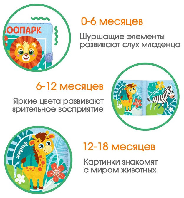 В данный момент этот товар отсутствует в продаже. Возможно, у нас найдется аналогичный или похожий товар здесь. Текстильная книжка-шуршалка «Зоопарк» станет отличным выбором для малышей от 3 месяцев. Компактный размер и яркие страницы помогут ребёнку познакомиться с животными, развивая внимание и слуховое восприятие.