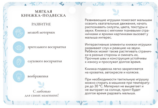 Крошка Я Мягкая книжка-подвеска с прорезывателем «Слоник»новинка В данный момент этот товар отсутствует в продаже. Возможно, у нас найдется аналогичный или похожий товар здесь. Мягкая игрушка-книжка с прорезывателем «Слоник» — идеальный выбор для самых маленьких. Игрушка совмещает несколько функций: мягкая книжка с яркими страницами, подвеска для коляски или кроватки, погремушка и силиконовый прорезыватель, который помогает облегчить дискомфорт при прорезывании зубов. |