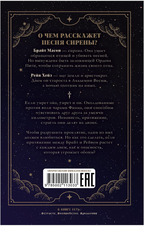 Брайт Масон — сирена. Она умеет обращаться птицей и убивать песней. Но вынуждена быть заложницей Ордена Пяти, чтобы сохранить жизнь своего отца. Рейв Хейз — маг земли и аристократ. Днем он староста в Академии Весны, а ночью охотник на иных. Если умрет она, умрет и он. Околдованные против воли чарами Фиама, они способны чувствовать друг друга за тысячи километров. Ненависть, притяжение, страсть они делят на двоих. Чтобы разрушить проклятие, один из них должен влюбиться. Но как это сделать, если притяжение между Брайт и Рейвом растет с каждым днем, как и опасность, которая угрожает обоим?