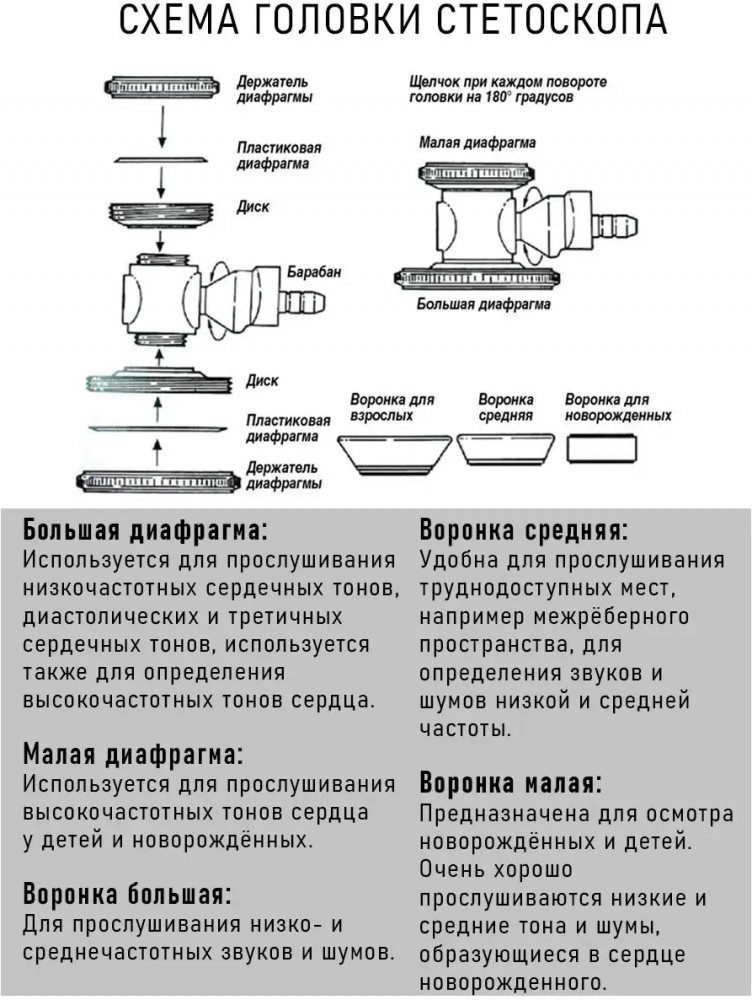 • воронка малая — предназначена для осмотра новорождённых и детей, хорошо прослушиваются низкие и средние тона и шумы, образующиеся в сердце новорождённого.