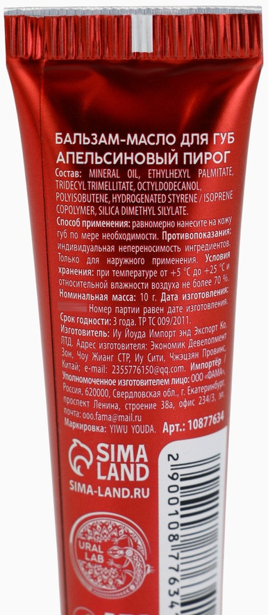 Бальзам-масло для губ «Апельсиновый пирог»: Mineral Oil, Ethylhexyl Palmitate, Tridecyl Trimellitate, Octyldodecanol, Polyisobutene, Hydrogenated Styrene / Isoprene Copolymer, Silica Dimethyl Silylate.