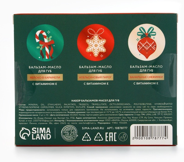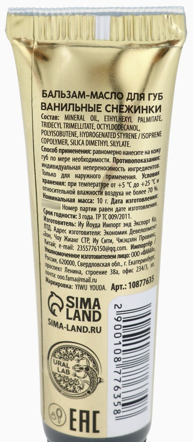 Бальзам-масло для губ «Ванильные снежинки»: Mineral Oil, Ethylhexyl Palmitate, Tridecyl Trimellitate, Octyldodecanol, Polyisobutene, Hydrogenated Styrene / Isoprene Copolymer, Silica Dimethyl Silylate.