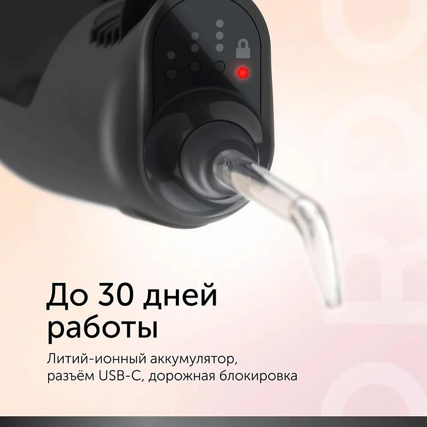 • ирригатор оборудован удобной системой хранения насадок внутри корпуса, что обеспечивает компактность и легкость транспортировки;